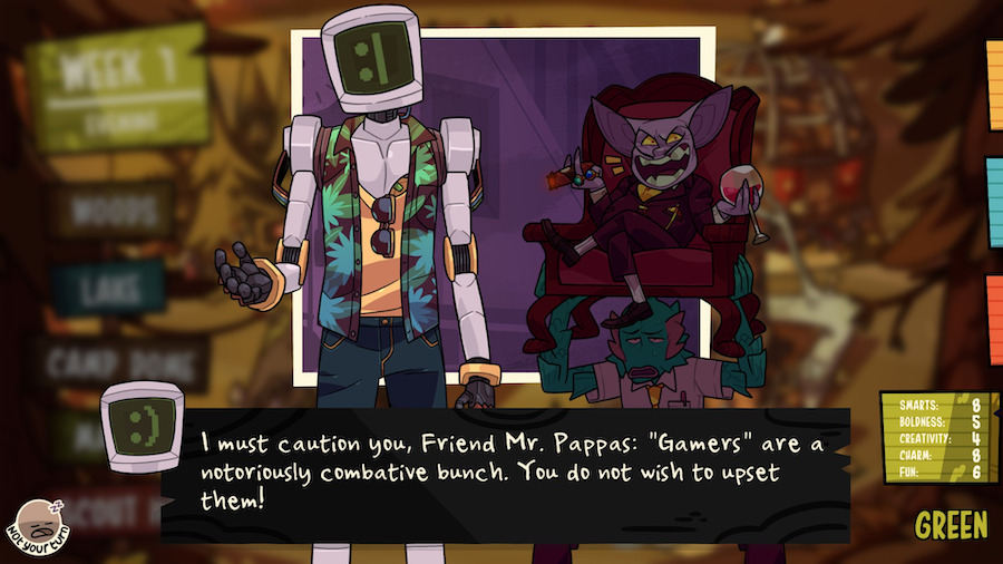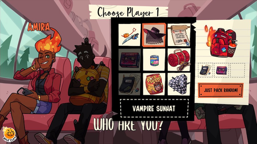 The first important choice for players to make, after discussing player limits and safety, is to toggle any relevant content filters. The second important choice is more a matter of style. Because the game plays out through text, and voiceover is limited, it is helpful to decide if players will be reading text to themselves, reading it aloud, or utilizing some hybrid of the two. Reading in silence was accompanied by chuckles and occasional commentary in my game, but was also plagued with players needing to ask if everybody was ready to proceed. There was also an anxiety about reading too slowly. I enjoyed the games where we all embraced corny, over-the-top, voices and narration, because it provided a unified rhythm and pace to the game that we could all experience together. However, we’re all tabletop role-playing enthusiasts, so silly voices are well within our comfort zone. Every group’s mileage will vary between these two approaches, and a brief discussion at the beginning of the game will likely grant a degree of insight into what method will work best for each particular group. The first mechanical choices, though, might be made without any insight at all. The game opens with a cast of monsters on a bus. Players choose their character and a handful of items that will help them pursue their ultimate goal – convincing a specific sexy monster to watch a meteor shower with them at the end of summer camp. The items offer bonuses to a character’s stats, and the monsters players are meant to date are derived from a seemingly unrelated question that is asked before the characters even arrive at camp. There is no immediately clear indication what the items will do in terms of stats, and, technically, the question answers don’t directly state which monster character the players will be pursuing, but it doesn’t take too long to become familiar with the items and which answers correspond with which dating options can be intuited after a playthrough or two. What is more difficult is figuring out what will unfold from most of the subsequent choices the game has in store for its players.