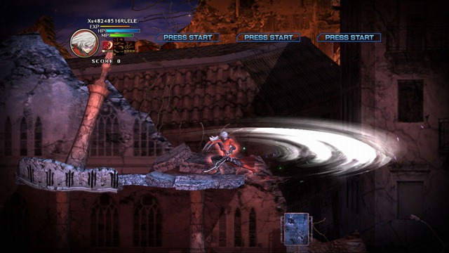 However, it isn’t fair of me to just compare Moon Diver to Strider. Although it pales in comparison to the early series, it should be judged on its own merits. Obviously, the game’s probably fun without being blinded by nostalgia, right? Well… not exactly… Despite the ability to climb and leap all over the place, Moon Diver is surprisingly combat-centric. Although there’s only one attack button per se, there are a lot of ways to hurt enemies. Double jumping is an attack, rolling is an attack, air-dashing is an attack, getting up from a ledge is an attack, getting down from a ledge is an attack, and even leveling up is an attack. While this all seems well and good, all this attacking feels really empty when enemies hardly respond to attacks and die in a strike or two. However, to add a little variety, you can give your attacks a bit more punch by charging them. The more you hold the attack button, the more powerful and lengthy the character’s attack becomes. While these generally annihilate any foes in their path, these strikes can also knock heavier enemies down, which can occasionally (rarely) be used to start juggling enemies.