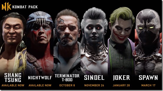 NetherRealm Studios and Warer Bros. revealed the full Kombat Pack roster for Mortal Kombat 11 with a brand-new trailer. It features Terminator T-800 from the Terminator series, Joker, and Spawn as guests, Shang Tsung, Nightwolf, Sindel as returning fighters. Shang Tsung and Nightwolf are now available. The next to follow is Terminator T-800 on October 8, 2019 followed by Sindel on November 26, Joker on January 28, and Spawn on March 17, 2020.