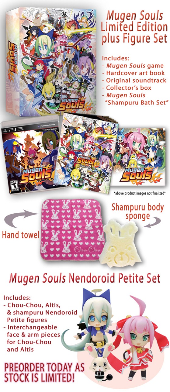 NIS America have announced a limited edition plus figure set for Mugen Souls. At $100 in price, the set will include a hardcover artbook, the game’s soundtrack, a hand towel and body sponge, and Nendoroid figures of characters Chou-Chou, Altis, and Shampuru. Take a look at the set below: