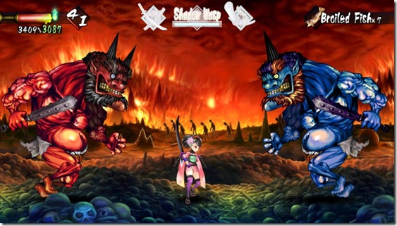 Muramasa Rebirth is an odd game. At first, I didn’t quite understand why it felt obliged to be a brawler-meets-RPG hybrid. Things felt disconnected. It’s a very fast game, so some of things that felt more RPG-like seemed almost unnecessary. Sure, the safe areas where you could buy items and eat meticulously animated soba and dango were interesting, but when the rest of the game is about running around, tearing through tons of ninjas and demons as quickly as possible, things like weapon-forging trees and fullness gauges that prevent you from spamming healing items seem a tad extraneous. It would be one thing if you gained different attacks as you leveled up, but your standard moveset doesn’t change at all throughout the course of the game. You can do dashing rising slashes (which can be chained together to knock enemies further into the air), sliding slashes, air and ground combos, launchers, a somewhat impractical front-flipping slash, and an aerial plunge. All of this is mapped to the Square button, which, should you hold it, is also your block button. On top of that, you’ve got the ability to do a screen-filling sword drawing attack by swapping swords with Triangle after one breaks, or after waiting for a while. No matter which sword you use, no matter how much you level up, you’ve always got those abilities. The speed and animation of certain attacks change whether you use long swords or normal katanas, but your basic moveset is always the same. Adding a bit more variety is the fact that each sword has its own specific Secret Art, which can vary from a screen-spanning dash to a phantom projection of your character that slashes away at your enemies from behind to an exploding projectile. Since you can have three swords equipped at any given time, you’ve basically got three special attacks in addition to your standard moveset. You can’t completely abuse these though, since each Secret Art you use will drain a bit of your sword’s energy, which is also drained by blocking attacks. Should that energy be depleted, your sword will break, and you’ll have to wait for it to repair itself. Thus, you have to balance blocking and Secret Arts to make sure you don’t find yourself running away from your enemies with three broken swords until they magically reforge themselves.