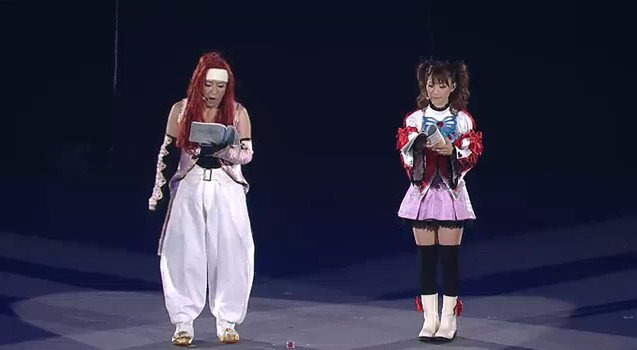 I had no idea what to expect when I arrived at Tales of Festival 2013. The name made me think that perhaps it would be a gaming event in the vein of PAX, but on a smaller scale, since it was only focused around a single franchise. Oh, how wrong I was. What greeted me when I arrived couldn’t have been further from my expectations. Due to a Saturday class, I arrived at Yokohama Arena a couple hours after the doors opened, a few minutes after the show proper began. As I was ushered to my seat, I saw an assortment of voice actors onstage in various states of cosplay, reading off scripts as the traditional Tales skit character portraits animated along to their dialogue. It was somewhat surreal to me for a number of reasons. First of all, I was surprised to see performers onstage with their scripts in hand at any sort of professional event, but that surrealism was amplified by the fact that only certain voice actors were in costume. Katsuyuki Konishi and Masaya Onosaka (Lloyd Irving and Zelos Wilder from Tales of Symphonia and its sequel) were dressed up as their characters, complete with some of the most bizarre wigs I’ve ever seen. Slightly less jarring were Tales of Graces’ Shiho Kawaragi (Cheria Barnes) and Tales of Phantasia’s Satomi Koorogi (Mint Adenade), who dressed as their characters, but simply styled their own hair to match them. Tales of Xillia 1 and 2’s Ryoutarou Okiayuu wore not only an approximation of his character’s costume, but also a hat of sorts with a katakana “ga” on it to show that he was, in fact, Gaius (as well as a strange, plush, swordlike hat). Some of the other voice actors, while still rather flamboyant, were dressed in more practical, semi-character-inspired clothing. For instance, Hikaru Midorikawa had done his hair like his character Leon Magnus from Tales of Destiny, Mamoru Miyano dressed in blue and white like Flynn Scifo in Tales of Vesperia, and Hiro Shimono’s very conspicuous black and yellow shoes brought to mind Emil Castagnier from Tales of Symphonia: Dawn of the New World. The other voice actors, Tsubasa Yonaga (Jude Mathis from Tales of Xillia), Kousuke Toriumi (Yuri Lowell from Tales of Vesperia), Yuki Horinaka (Elise Lutus from Xillia), and Akemi Okamura (Sheena Fujibayashi from Symphonia) didn’t really dress like their characters, but for the audience in Yokohama Arena, I don’t think they had to. The mere appearance of these actors onstage would cause the crowd to erupt in applause (or, in the case of Yuki Horinaka, shouts of “kawaii” from both male and female members of the crowd). At one point, Yonaga and Toriumi hugged and the audience practically exploded. In fact, one of the surprising (and impressive) things about the Tales of Festival was how loud and excited the fans were. People would call out to their favorite voice actors while they were onstage just to try and get a response. The fervor over the voice actors alone was kind of incredible, as were the responses to the skit they were performing from their scripts. We’ve all seen a character serve a bad cake to their friends in anime and games before, but when the Symphonia cast tried some of the cake that Flynn made in the skit, you would have thought that someone had told the funniest joke in the world.