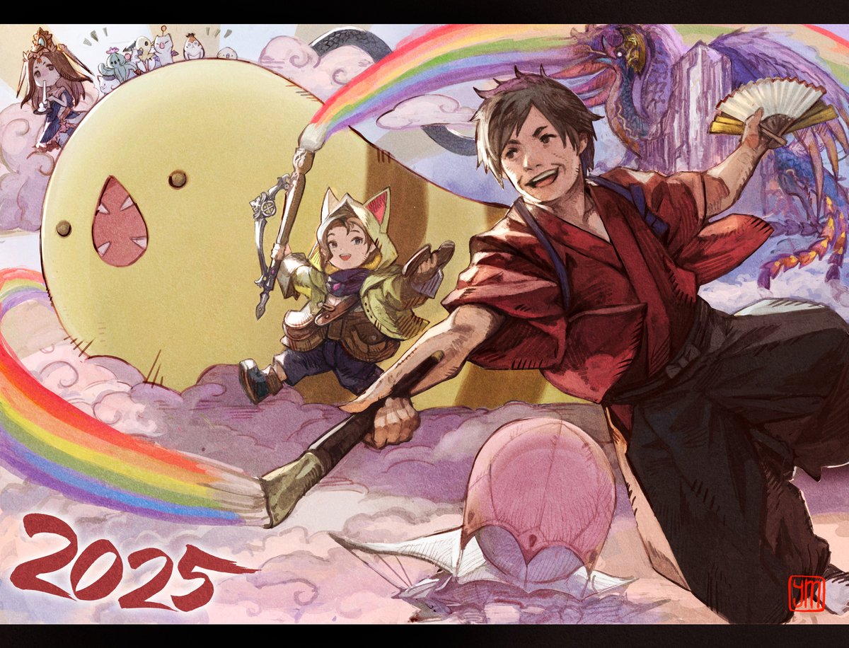 Finally, here’s the 2025 Final Fantasy XIV New Year’s art that shows a character who looks like Naoki Yoshida, the Great Serpent of Ronka, the FFXIV Dawntrail Pictomancer Krile, and other mascots like a Moogle and Chocobo riding on the snake.