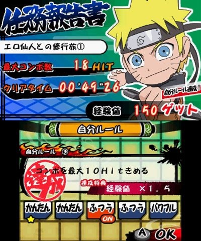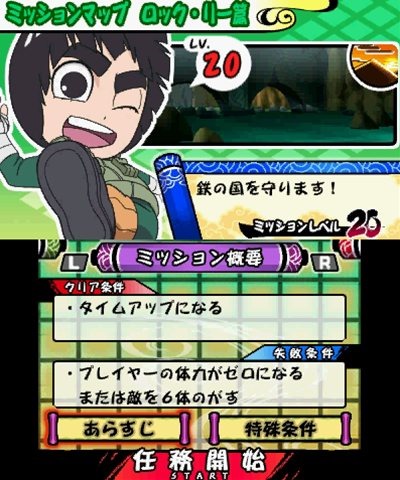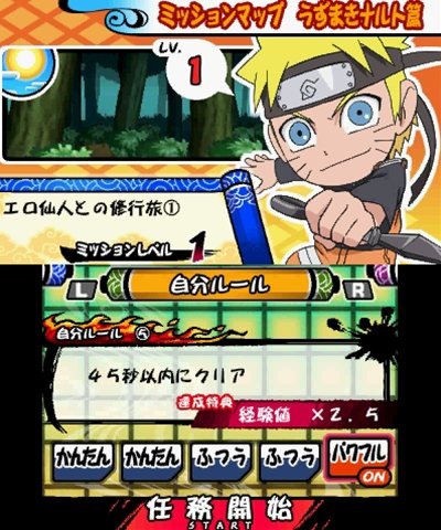 Naruto SD Powerful Shippuden is broken into missions like defeat all of the enemies or block enemies from passing a line. There are 100 different missions in the Nintendo 3DS game and custom rule sets that increase the difficulty.