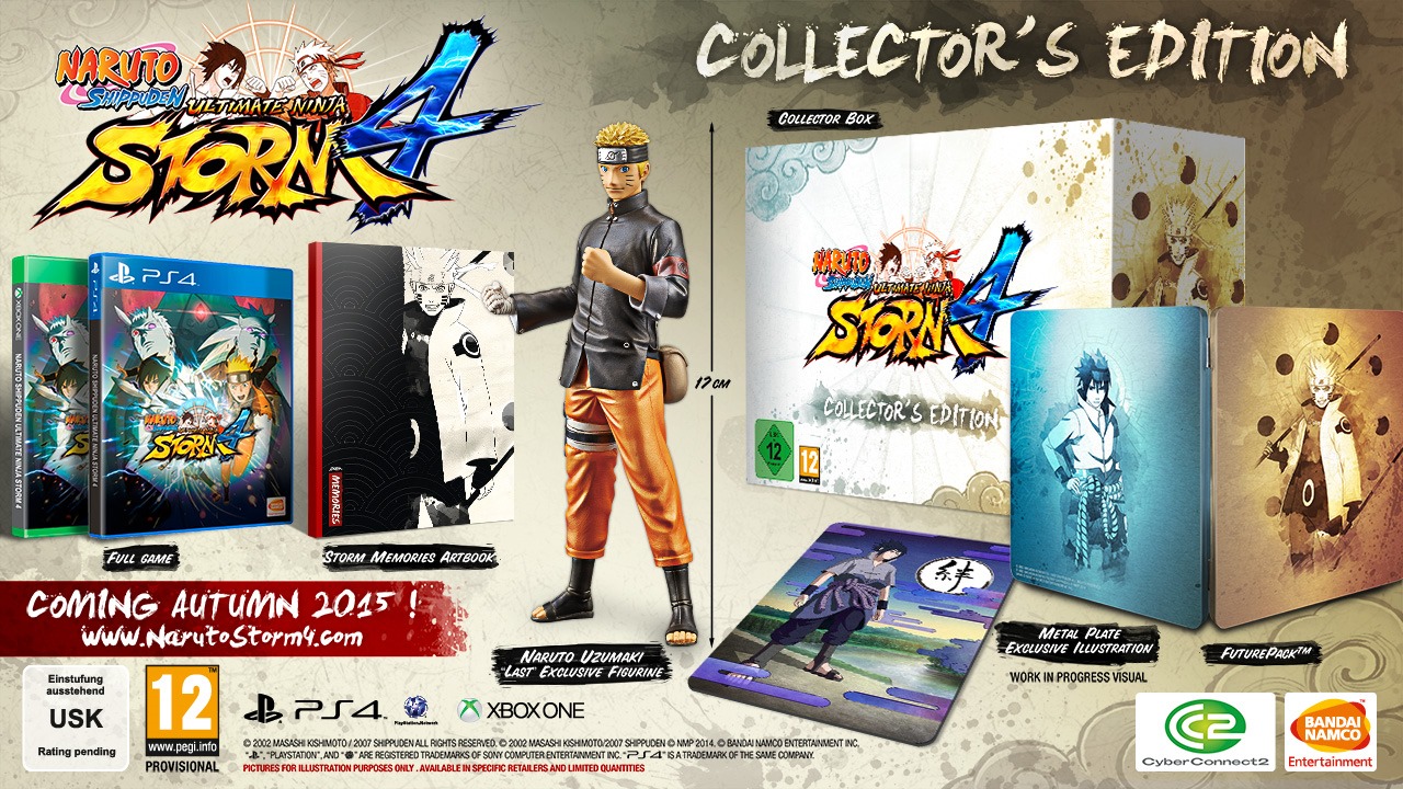 Bandai Namco Entertainment Europe announced a collectors edition for Naruto Shippuden: Ultimate Ninja Storm 4. This bundle includes the game, metal plate with an illustration of Sasuke, a Storm Memories art book, and a Naruto figure based on The Last: Naruto the Movie.