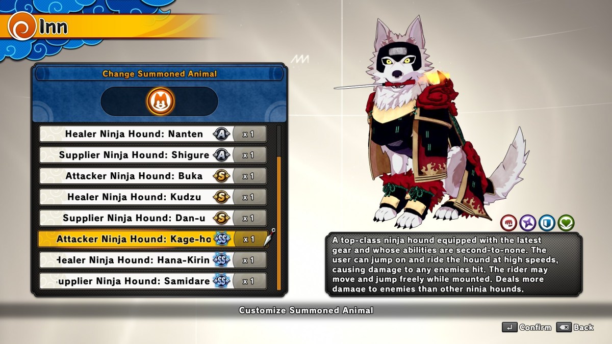 At the Inn after the update, people can now change their Summoned Animals and select different Ninja Hounds. When in a fight, you can ride them for increased speeds and jumps. Rare ones will be acquired via Scroll Appraisal. They are the first animals in the game, with more fully released in June 2024. The initial screenshot however did show various Attacker, Healer, and Supplier Ninja Hounds ranging from A to SS rank.