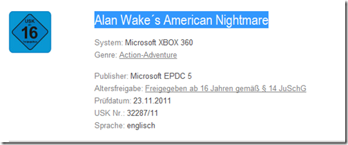 Microsoft has been teasing a standalone Alan Wake game for Xbox Live Arcade. The title will be revealed at the VGAs this weekend, but Germany’s video game rating board beat Spike to the punch. Unless Microsoft has multiple Alan Wake games in development, the the name of the next Alan Wake game is Alan Wake’s American Nightmare.