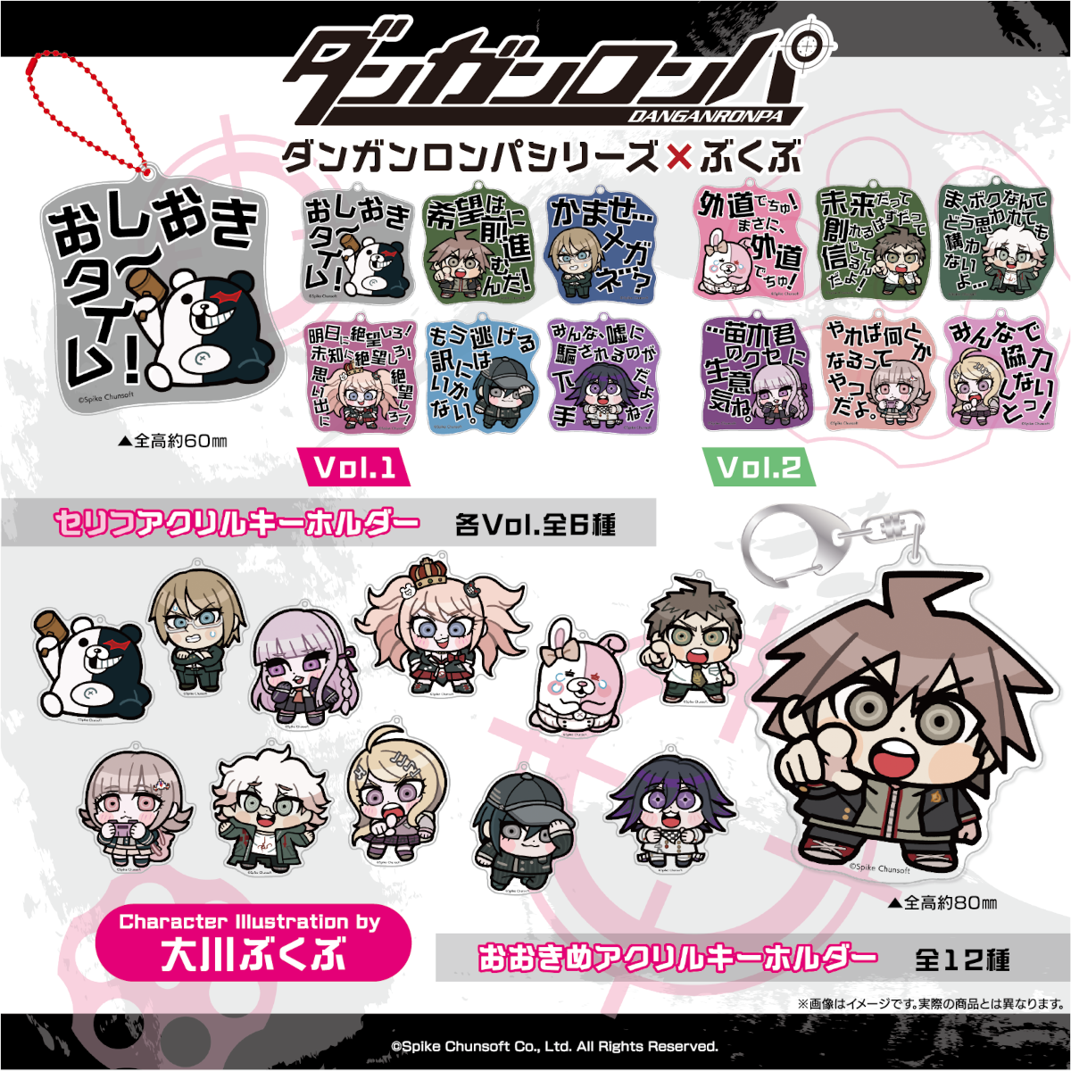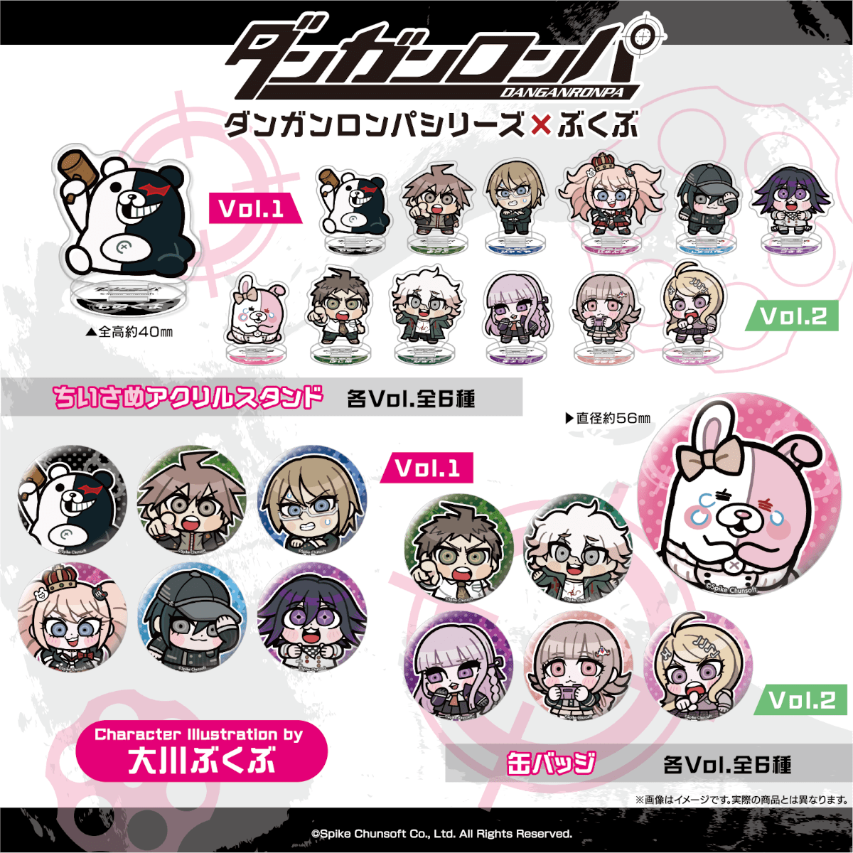 Bkub has drawn his own renditions of ten characters spread over all three mainline Danganronpa entries, in addition to the series mascots Monokuma and Monomi. The lineup will mostly consist of common badges, acrylic stands, and stickers, but it will also include hair clips featuring the chibi character heads.