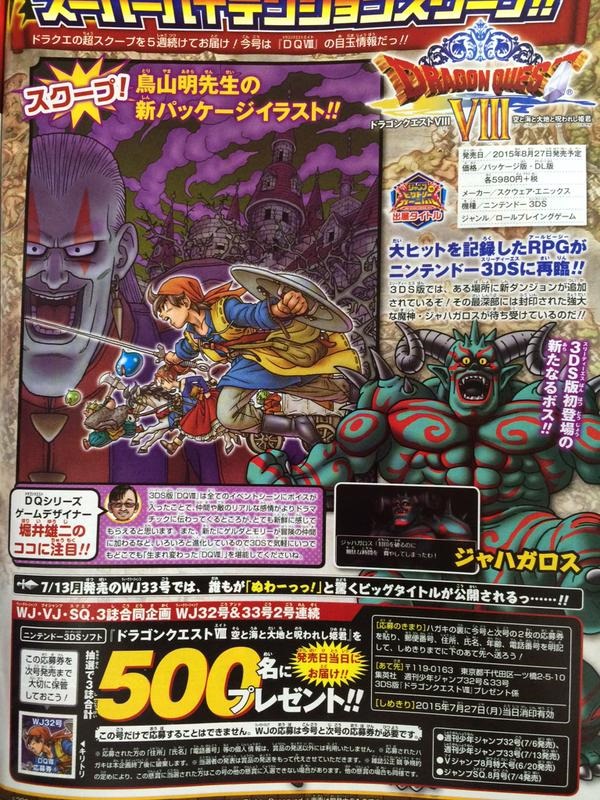 Dragon Quest VIII on Nintendo 3DS will have a new dungeon with a new boss named Jahagaros, according to the latest issue of Jump. (Thanks, @kazu4281) Jump also say they will reveal a big title in next week’s issue, and judging by the wording this is a Dragon Quest-related announcement. What will the new game be? Your guess is as good as ours, but keep in mind that Square Enix are working on a new Dragon Quest Monsters game. Food for thought: The wording in Jump states that the reveal will make readers go “Nuwaaaa!” That’s a reference to Dragon Quest V.