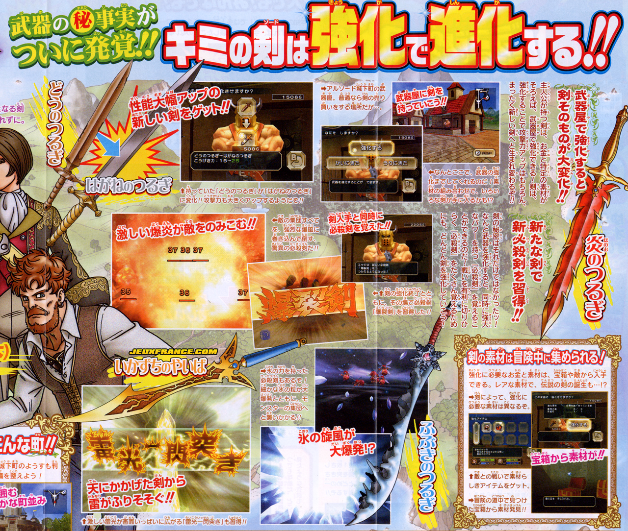 Jeux-France posted up some new Shonen Jump scans of Square-Enix’s latest Dragon Quest game Dragon Quest Swords for the Nintendo Wii a while back. These scans show more gameplay screens and details gameplay a bit more such as being able to temper his sword throughout the game to improve both its strength and durability. Furthermore, battles will make use of the Wiimote by players using the Wiimote as a sword. All those childhood memories you had of swinging a stick around, pretending it was a Master Sword of sorts, will finally be of some use since, you know, you’ll be hacking and slashing away with the Wiimote.