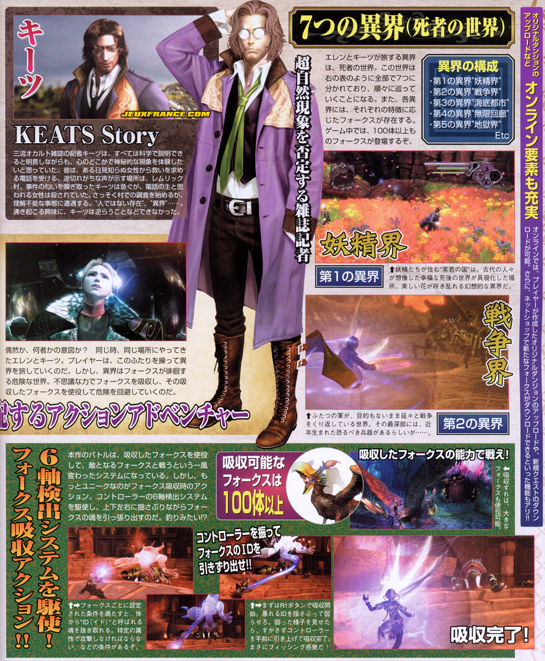 Remember the [tenative] box art shown for FolksSoul? Well, it just so happens that now Jeux-France by way of Famitsu magazine has some new scans of FolksSoul and information we already know regarding the story of the game’s main characters Ellen and Keats. The scans also show how one will go about using soul extraction (that’s what I’m calling it!) to extract a monster’s ID which can be used by Ellen and Keats to summon monsters in battle to aid them.