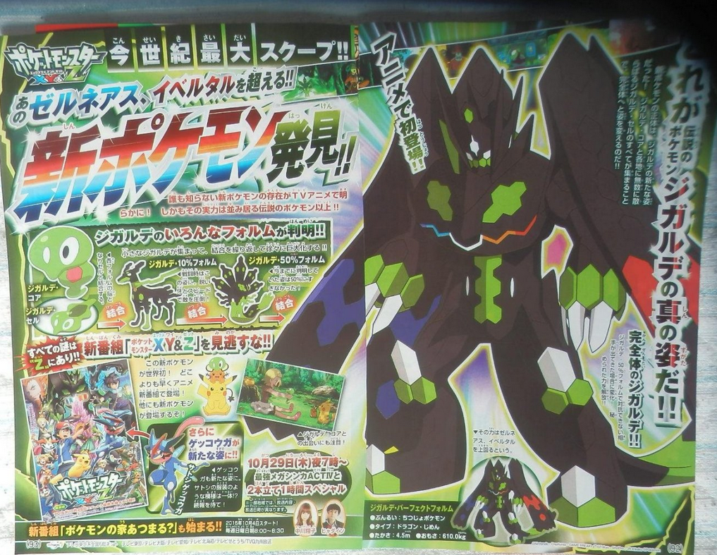 New images from this month’s issue of CoroCoro have leaked, revealing new forms the of the legendary Pokémon Zygarde [Thanks, Serebii.net.] Zygarde seems to have the ability to take on multiple forms, including a dog form named Zygarde 10% Forme, which relies on its high speed and sharp teeth in battle. Normal Zygarde is referred to as Zygarde 50% Forme. The large, imposing form is called Zygarde Perfect Forme and is supposedly even more powerful than Xerneas and Yveltal. The small, flat looking form is called Zygarde Cell, and the similar one directly above it is named the Zygarde Core and serves as the brain in every form the Pokémon takes.