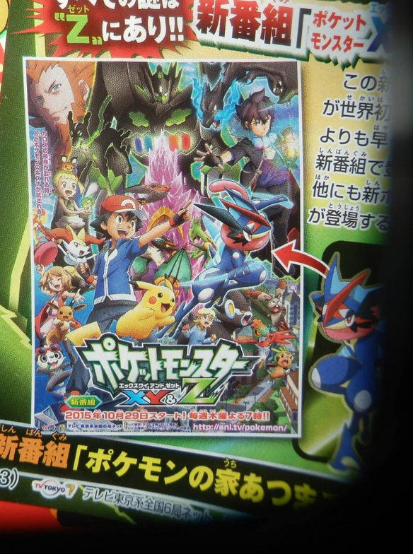 The second picture is a scan for the upcoming series Pokémon XY & Z, which begins airing on October 29 in Japan. The poster shows an interesting version of Greninja who appears to have coloring reminiscent of Ash’s clothing, and is even called “Ash Greninja.” However, not much else is known about it for now.