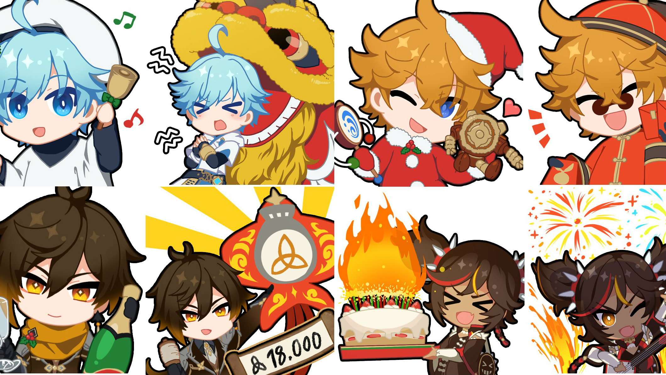 Here’s the official tweet announcing Soreko’s latest designs and offering a link to the Genshin Impact emojis. You have both Albedo and Ganyu, the two latest five-stars, in Christmas-y outfits and with omochi rice cakes for New Year’s, to start. Xingqiu is singing carols and preparing fai chun, while Qiqi is wearing a cute hat and receiving a red envelope. (Even though she’s a zombie that’s hundreds of years old, she is still technically a child.) Chongyun is ringing festive bells and being attacked by a dragon. Childe is the bearer of red envelopes and is dressed as Santa, just like Albedo. Zhongli has some wine and prepared a kite, while Xinyan is ready to rock in the holidays with music and a cake.