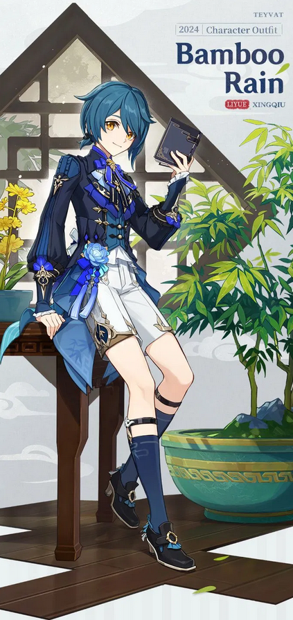 The Genshin Impact Xingqiu outfit is “Bamboo Rain” and you’ll be able to get it for free. You will only need to participate in the flagship “Vibrant Harriers Aloft in Spring Breeze” event, much like how Kaeya and Ningguang’s outfits were free. This outfit has a distinctly Fontaine feel, and Xingqiu has tied his hair up. He looks very put together. However, you can tell that he’s still the same little nerd underneath because he’s holding a book.