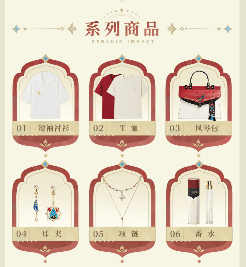 Some of the items look like normal anime merchandise in which they have the character on a simple shift. Others are more subtle. For example, one of Tighnari’s goods is a broach that looks like an arrow. It also has a floral design on it that resembles the flowers in his animations or splash art. You can also get a side bag that resembles the one Cyno carries as the General Mahamatra. For every character, there are six types of items: a short-sleeved shirt, a T-shirt, a bag, a piece of jewelry, a necklace, and perfume. The perfume comes in a gift box.