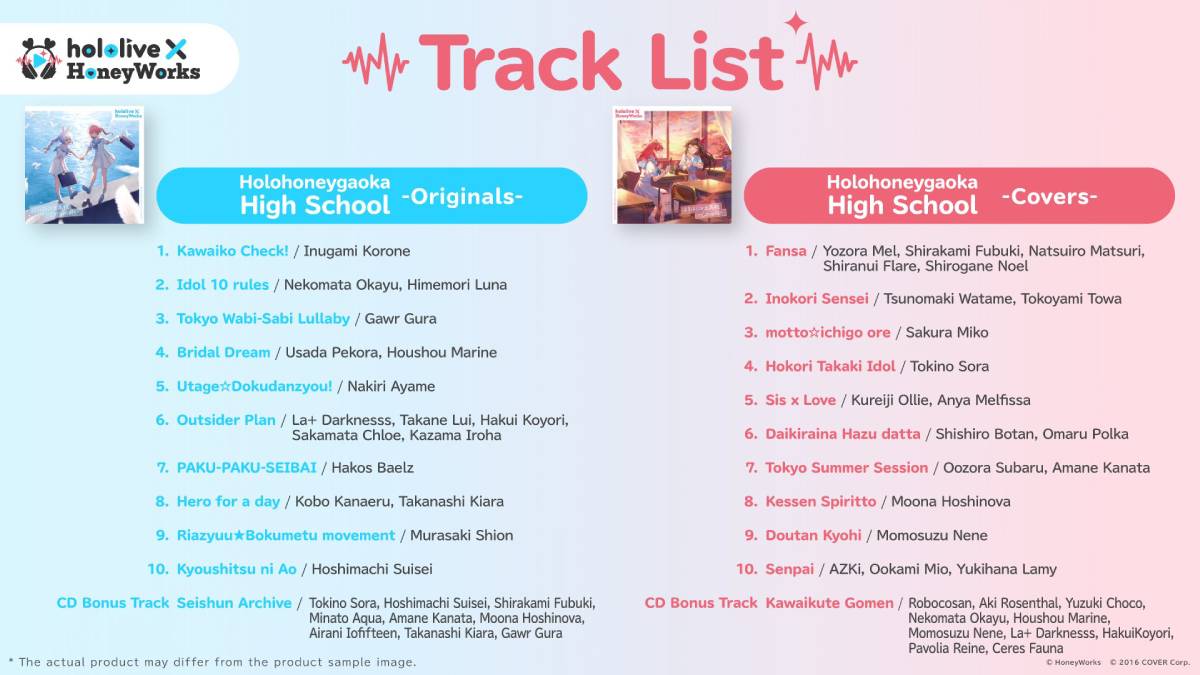 The Hololive Honeyworks albums are holoHoneygaoka High -Originals- and holoHoneygaoka High -Covers-. Those will be released on February 28, 2024. An official site is open for them. There’s also an infographic image sharing the ten songs that will be on each album.