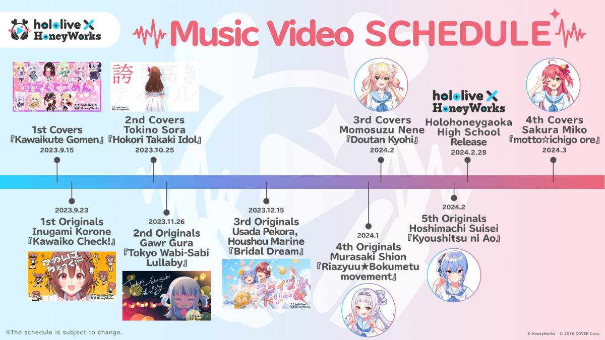 As for the upcoming schedule for more music videos, here’s the full image shared. It started with the 1st Covers’ “Kawaikute Gomen” and Inugami Korone’s original song “Kawaiko Check” in September 2023. Four are shown as coming in 2024 between January and March. Those will start with Murasaki Shion’s original song “Riazyuu Bokumetu Movement” and end with Sakura Miko’s cover of “Motto Ichigo Ore.”