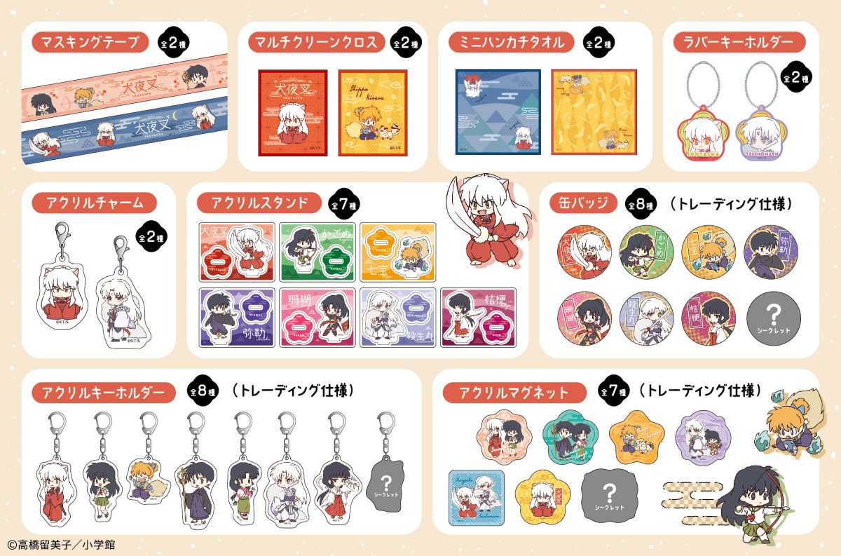 The characters featured in the merchandise items include Inuyasha, Kagome, Shippo and Kirara, Miroku, Sesshomaru and Rin, and Kikyo.