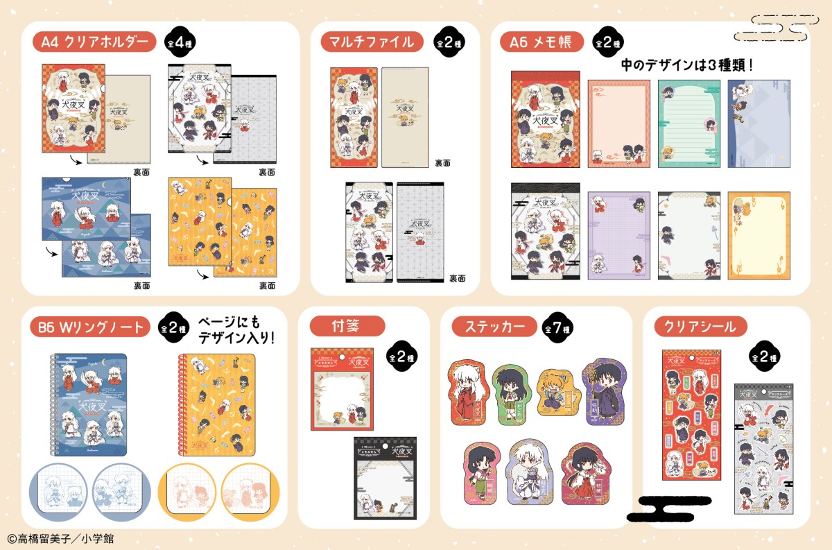 Depending on the store, items available might vary. Some of the items available as part of the new Inuyasha merchandise collection include clear file folders, multi folders, notepads, notebooks, sticky notes, stickers, masking tape, handerkchief towels, various acrylic stands, can badges, pens, and plush keychains, to name a few.