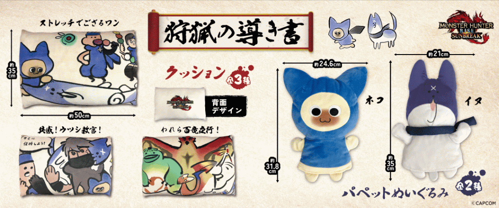 Capcom revealed a new set of merchandise modeled after Minoto’s drawings in the official online Hunting Guide for Monster Hunter Rise. The collection will consist of cushion pillows based on the drawings and hand puppets inspired by Minoto’s versions of the Palico and Palamute.
