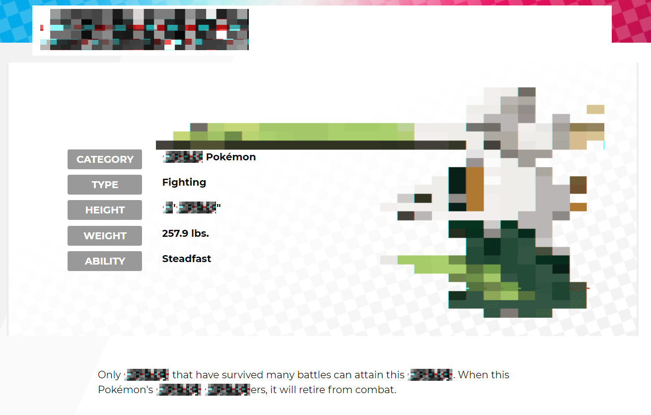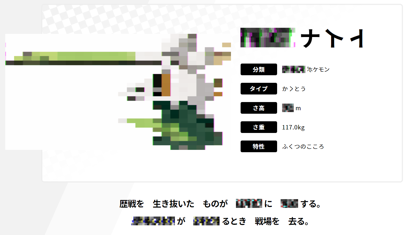 Today, the Pokemon Twitter announced that the official Japanese website has been updated with new info, and going to the site reveals a new Pokemon obscured with a glitching effect. The Japanese site reveals part of the Pokemon’s Japanese name, ‘-naito’, and it is fighting type. When accessed, a glitched out version of Rotom’s voice is played, implying that Rotom accidentally screwed up the webpage. While not linked, an English version of the page exists here, also showing off the new Pokemon.