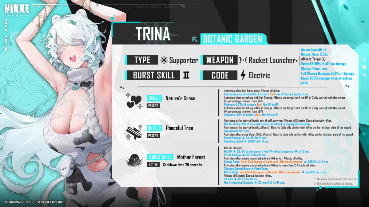 Trina will be a Supporter in NIKKE, and the new character is designed to both heal and buff allies. Her Nature’s Grace passive restores HP. Her Peaceful Time passive affects fellow Electric code units on her team and provides buffs like temporary invulnerability, increased attack damage, and increased loading speed. Her Mother Forest Burst II skill buffs affects all enemies skills Burst Skill damage, increases damage, and offers additional buffs for Electric types. She also wields the Rocket Launcher called Mother Nature, and she’s a part of the Missilis Manufacturer group.