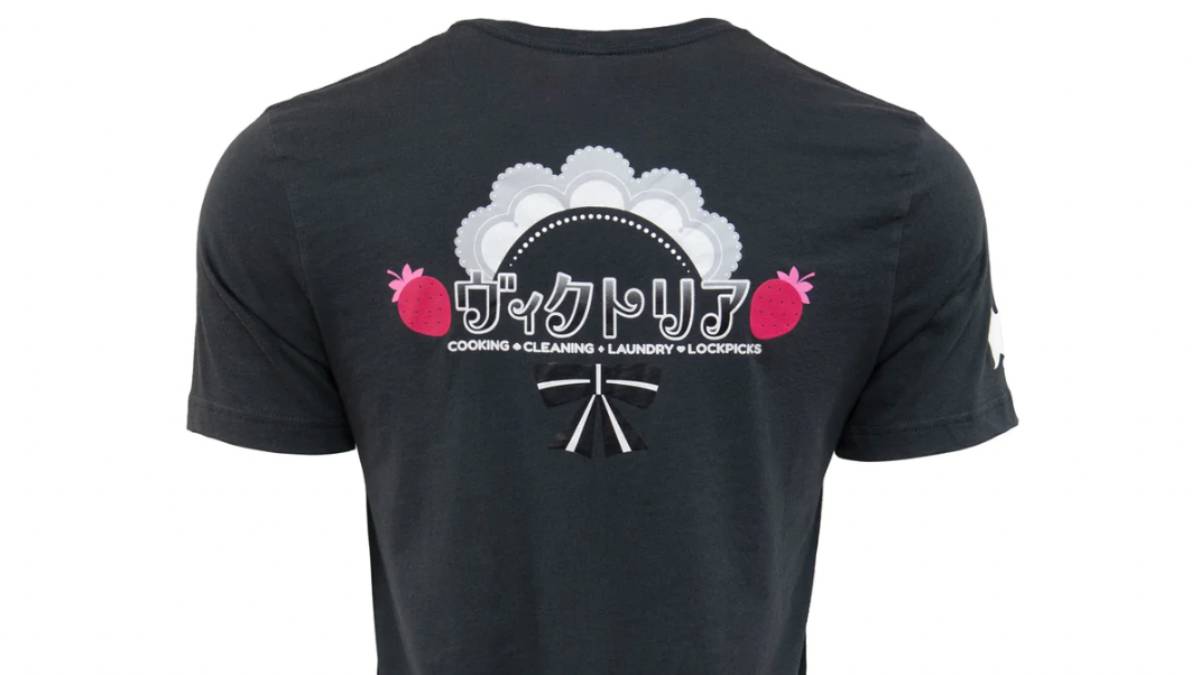 All three items play with the fact that while Ms. Sadayo Kawakami is a teacher at Shujin Academy during the day, she also works as a maid called Becky with the service Victoria in Persona 5 and its Royal update. Both of the shirts feature the full logo for the Victoria service the protagonist can call on the back and a smaller one on the front. The pin features the logo and a large strawberry, which is also part of the imagery for the maids. Finally, the keychain is of the maid uniform Kawakami wears at work.
