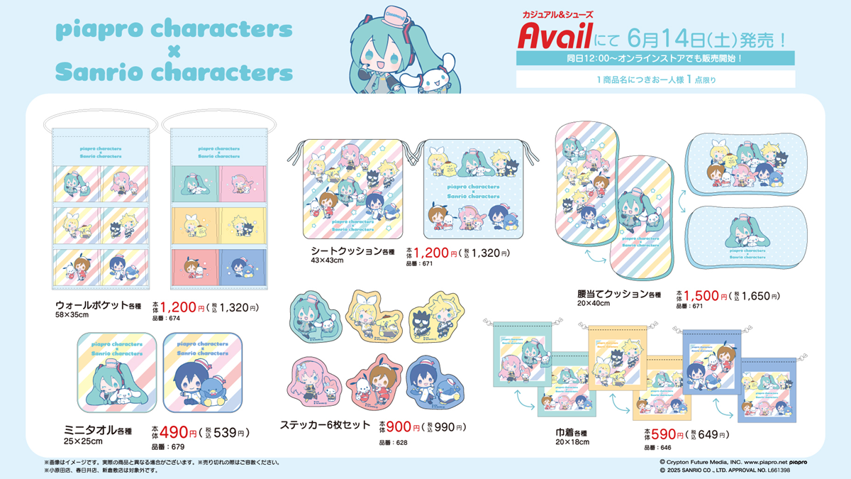 All the Sanrio character and Vocaloid collaboration clothes and items featuring Hatsune Miku and other singers will appear in Avail stores in Japan, both physical and online, from June 14, 2025.