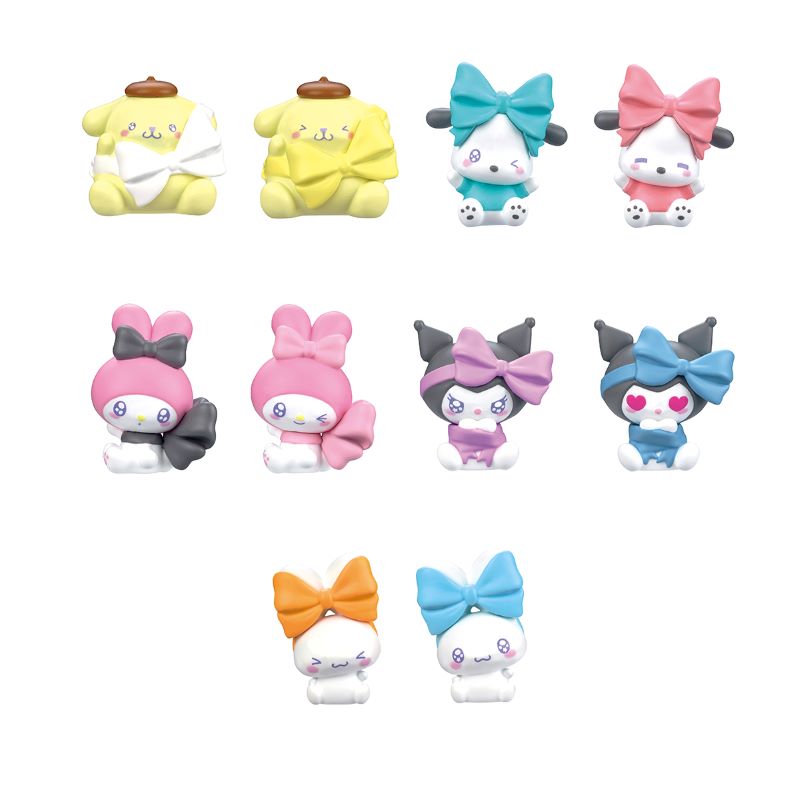 In the case of the Sanrio My Fave Color Bikkura Bath Bombs series, there are 10 possible toys. Each one is inside a bath bomb that smells like strawberry cake. Cinnamoroll, Kuromi, My Melody, Pochacco, and Pompompurin are all available, with two variants of each one as options. The general poses for each are identical, but the facial expressions and colors of the bows they wear will be different. As an example, Pochacco is wearing a pink bow with shirt and sleeping in one and winking and wearing a teal bow and shirt in the other. A full case contains 15 random toys, so someone will likely get doubles and might not get every character.