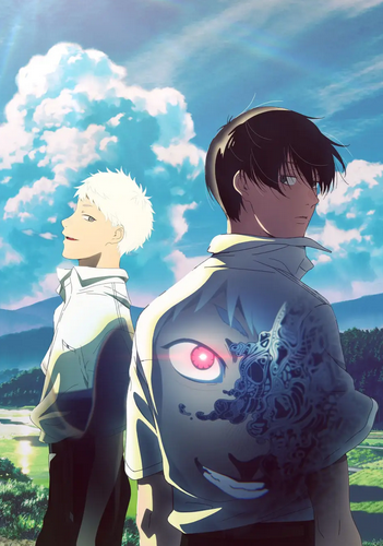 The key visual for the anime depicts Yoshiki and Hikaru standing in a field together. Hikaru is smiling at Yoshiki, who has the image of a red-eyed Hikaru whose face is half-covered in something bizarrely inhuman on his back. As for the character visuals, Yoshiki looks kind of sad while Hikaru is striking a cheery pose.