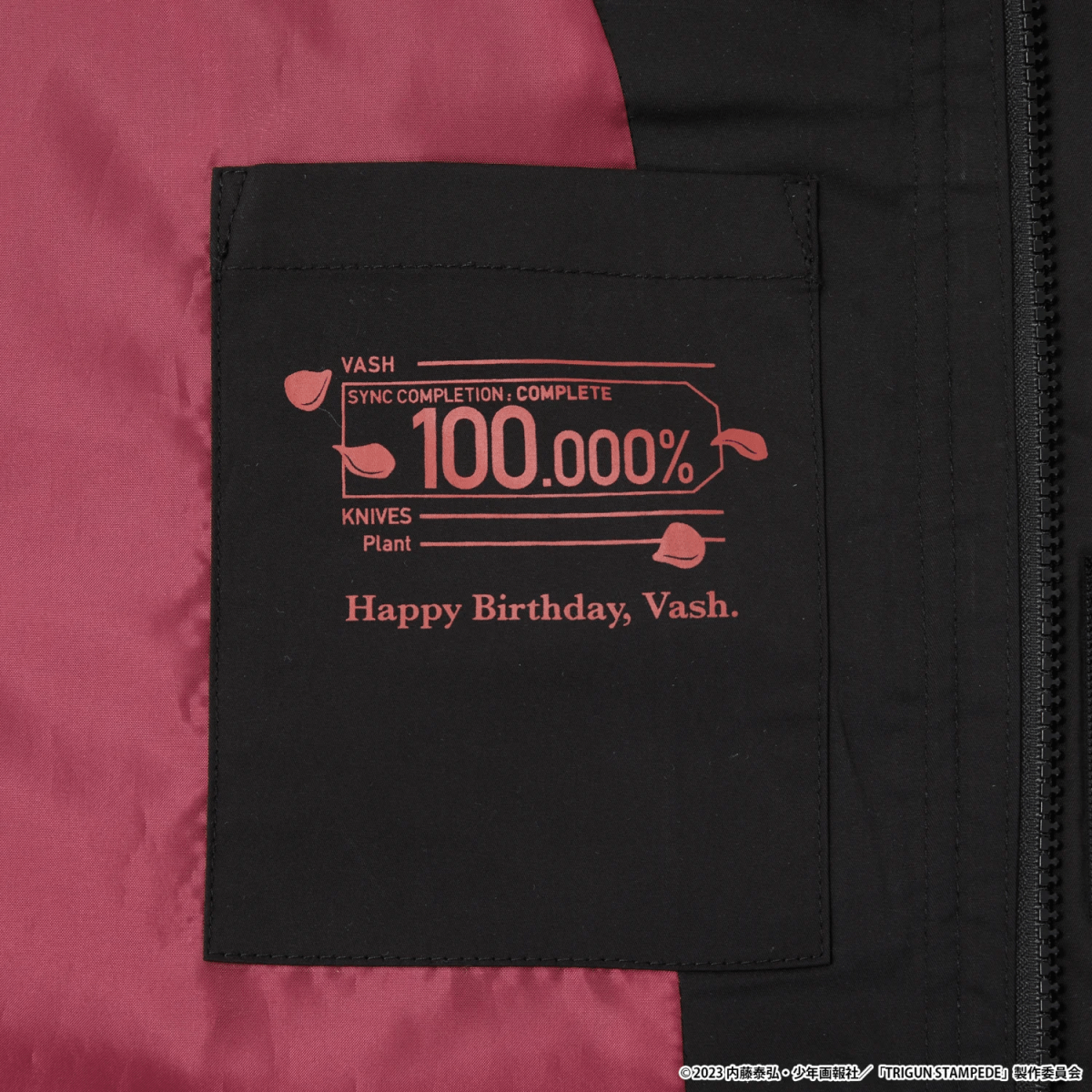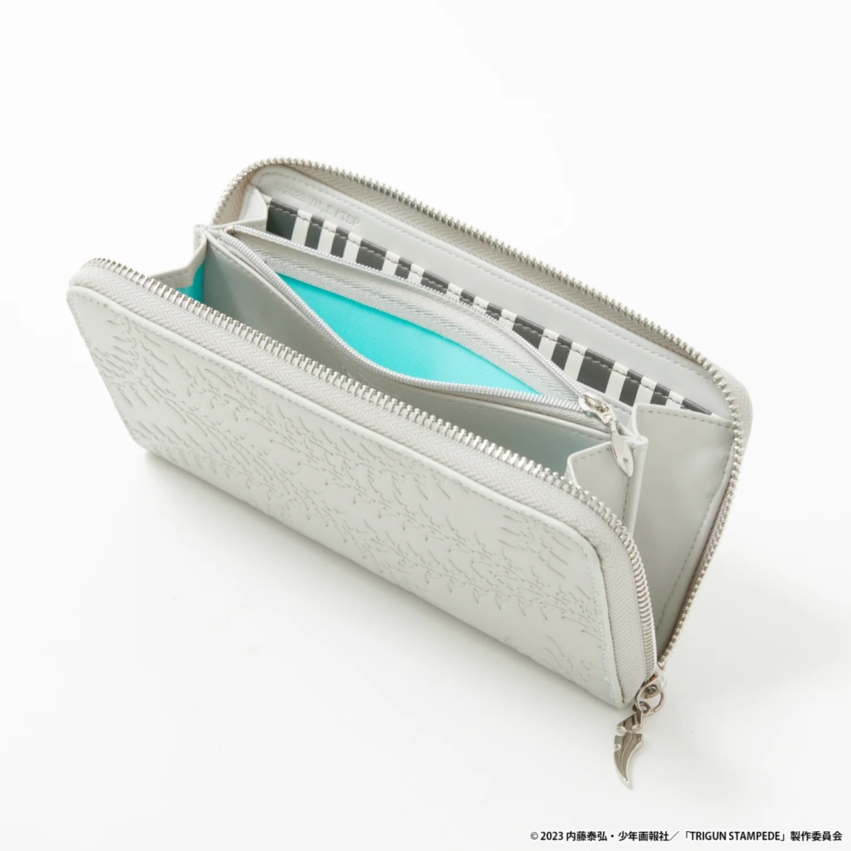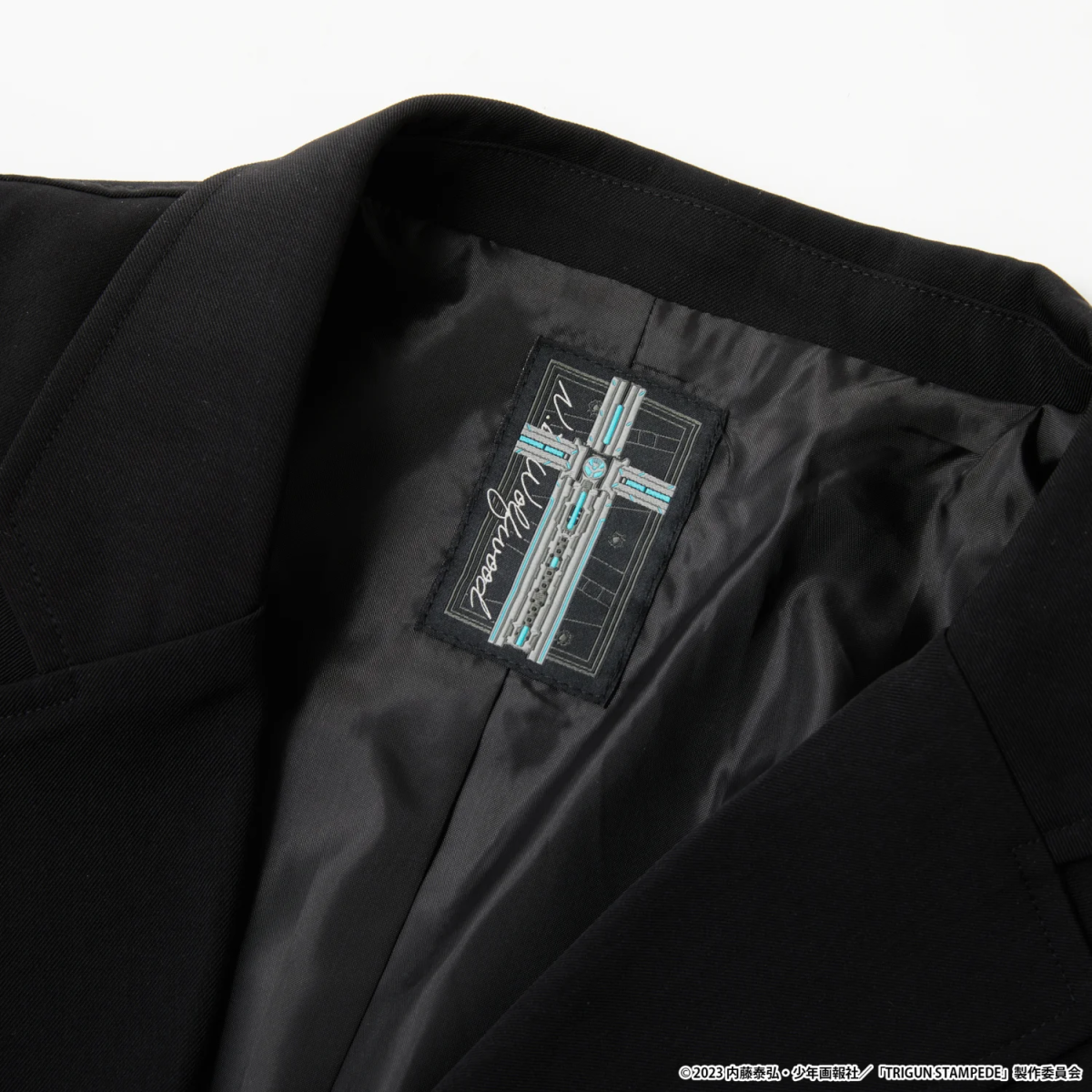Meanwhile, Wolfwood’s jacket is inspired by the priest’s own look. A neck label features his iconic Punisher weapon, and the inner pouch features a blue patch imitating the Skulls brand of tobacco he smokes in the anime. In addition, Wolfwood’s wallet also features the Punisher. As for Knives’ wallet, the outside features a knife inspired pattern, and the inside includes a cyan pouch, as well as a motif depicting him and Vash playing the piano as children.