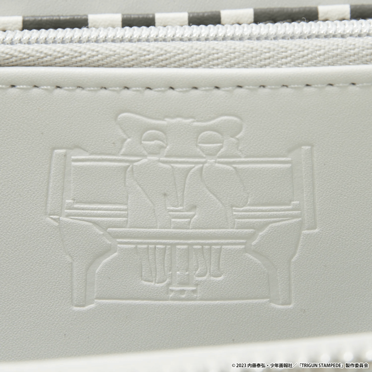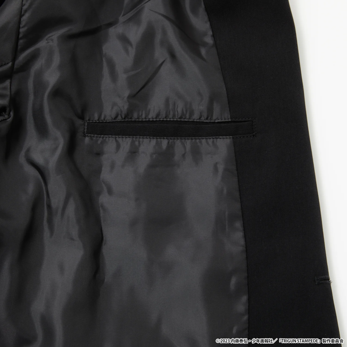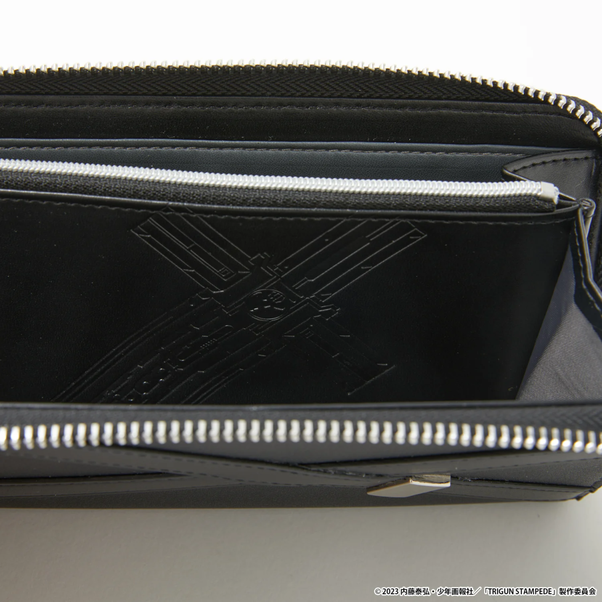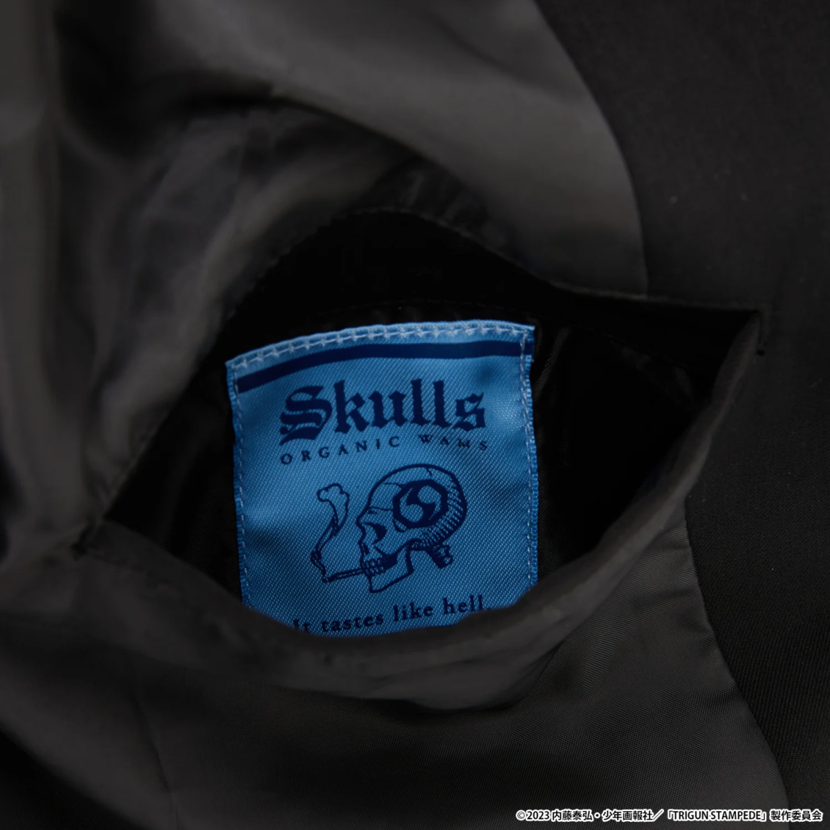 Meanwhile, Wolfwood’s jacket is inspired by the priest’s own look. A neck label features his iconic Punisher weapon, and the inner pouch features a blue patch imitating the Skulls brand of tobacco he smokes in the anime. In addition, Wolfwood’s wallet also features the Punisher. As for Knives’ wallet, the outside features a knife inspired pattern, and the inside includes a cyan pouch, as well as a motif depicting him and Vash playing the piano as children.