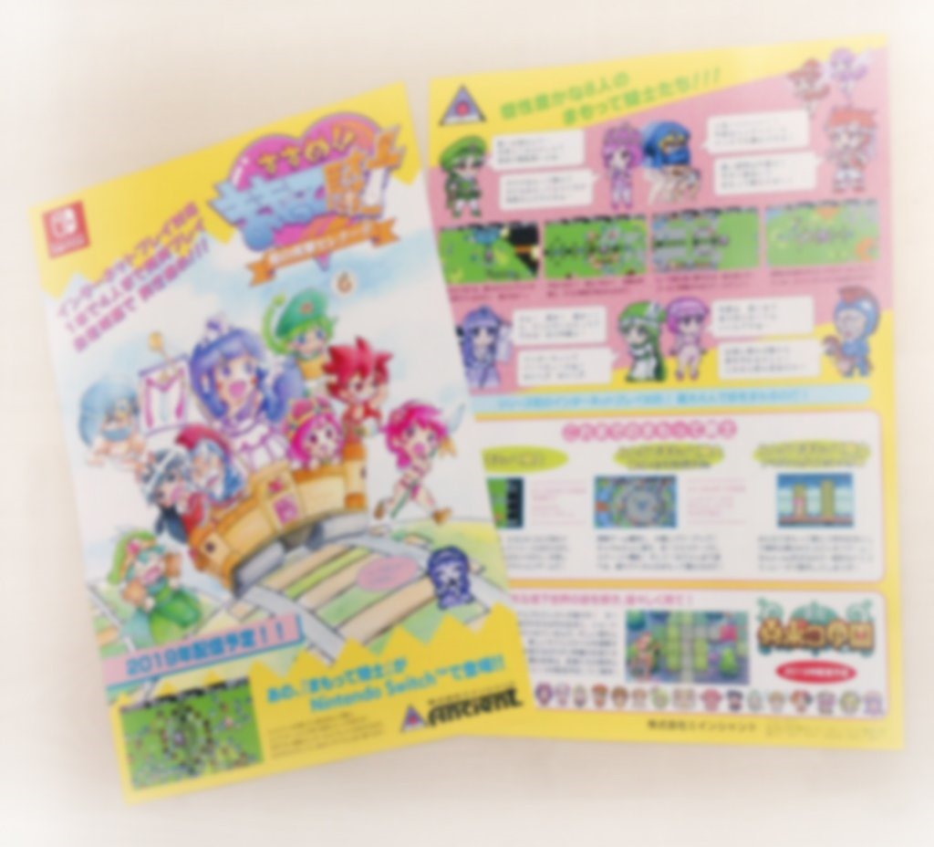 Due to the way Ancient Games purposely obscured information on the flyer, it is nearly impossible to discern any specific details. However, the logo image in the upper right corner on the front has the hiragana and kanji for “すすめ!! まもって騎士”(Susume!! Mamotte Knight.) We can also make out the Switch logo clearly in the upper left. It also looks like a 2019 release window is mentioned.