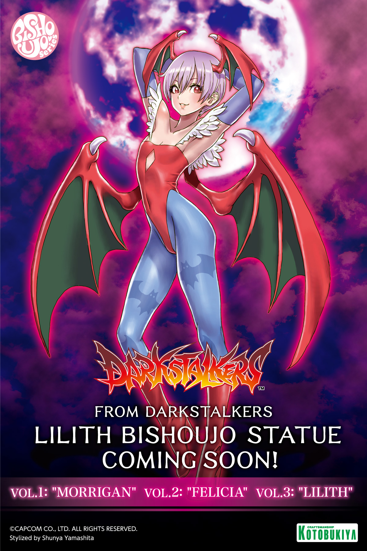 The third Kotobukiya Darkstalkers figure in the Bishoujo statue line will be Lilith. There’s no release date or prototype for her yet. However, the company shared the Shunya Yamashita concept art showing her off on Twitter. Here’s a closer look at how this version of Lilith will look.