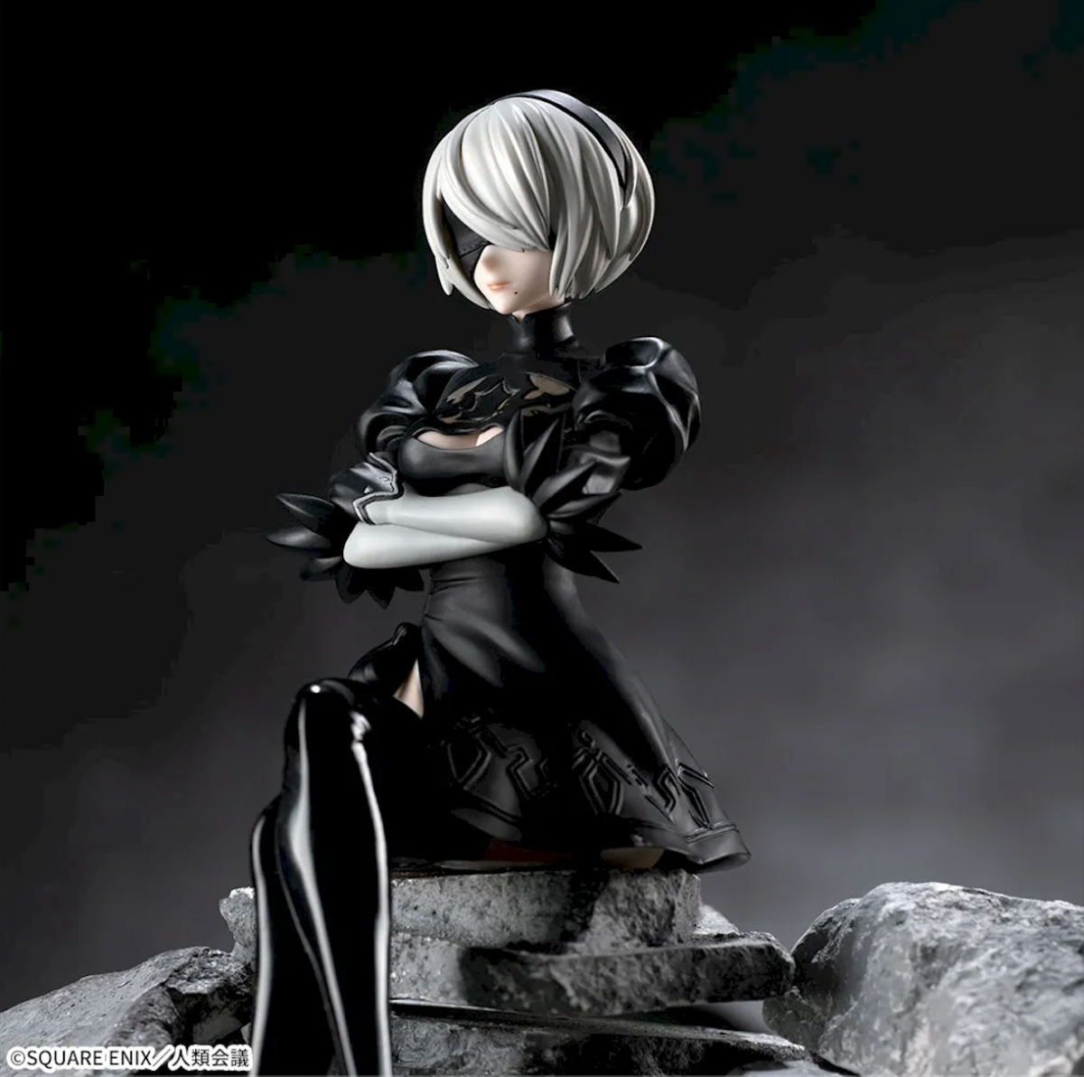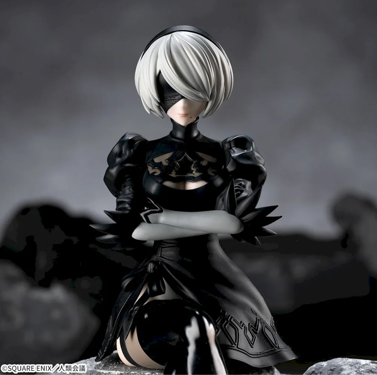 This 2B figure is in a seated position, so someone could display it on the edge of a shelf or use it in the same way they would a noodle stopper style piece. It sits at about 3 inches tall (7cm) due to that pose. She’s wearing her usual dress from the series. Her arms are crossed over her chest, and her legs are crossed. She doesn’t come with any additional face plates or posing parts.