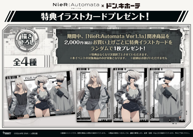 In addition, Don Quijote will distribute a random illustration card for every ¥2,000 made on a single receipt. The card will feature either A2, 2B, 9S, or even all three of them for the lucky receivers. Medicos also promised that it will put up the items for online sale via its own web store in the near future.