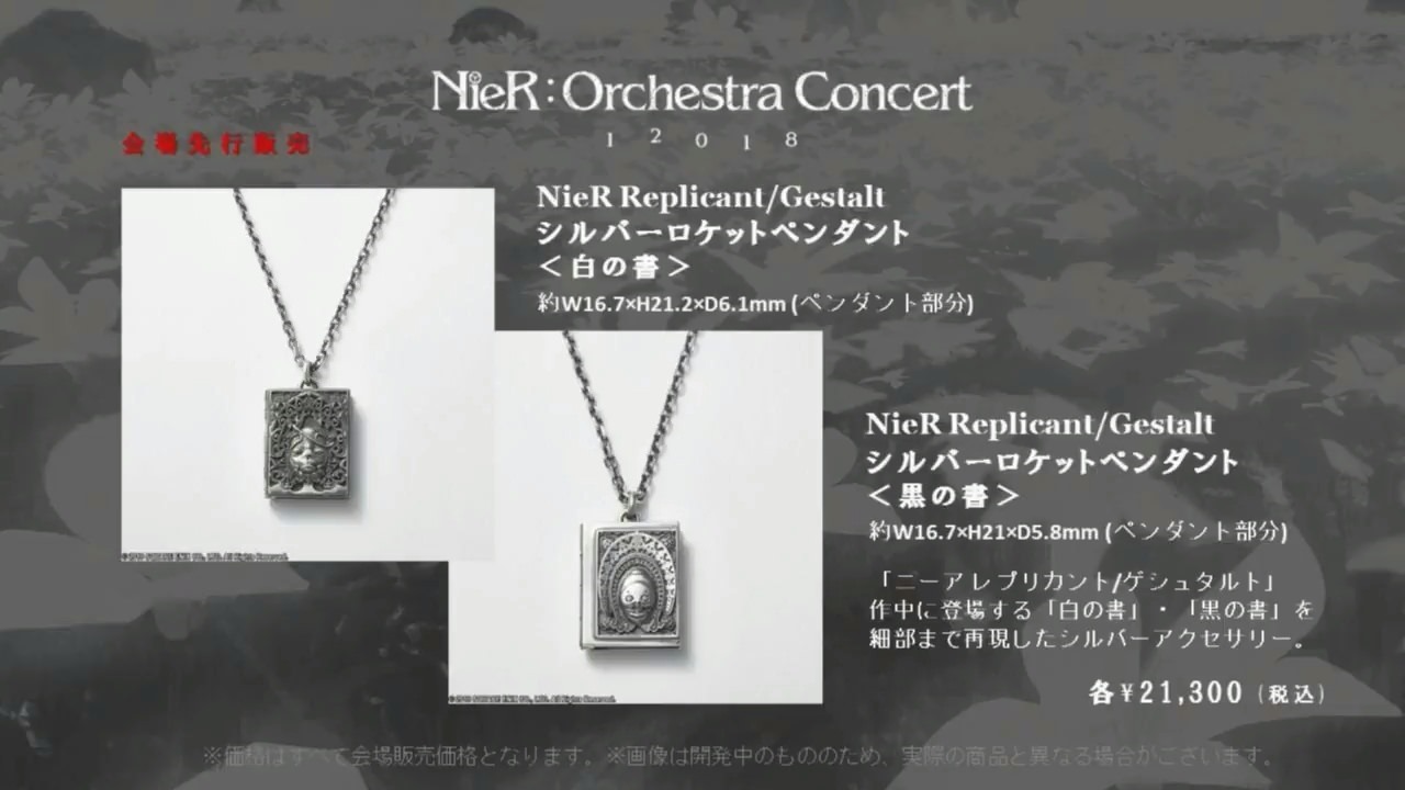 cQA1iso An A3-size clear poster featuring the concert’s key visual, and ticket case to hold your tickets, passport, and more.   Tote Bag (2,100 yen) & T-Shirt (3,200 yen) dUpKH0f J8uTmMR An Emil in the shape of a music note on a tote bag, and an original T-shirt designed by PlatinumGames.   NieR RepliCant/Gestalt Music Box “Kainé/Salvation” & NieR: Automata Music Box “Weight of the World” (1,600 yen each) pk26mva ALteOH1 CE1wCQV   Cup & Saucer (3,200 yen each) f2iTcIU The NieR RepliCant/Gestalt Cup & Saucer has a designed based on the Lunar Tear. The NieR: Automata one has a design based on 2B’s pattern.   F2IUChc T6gnXqY Q0NXDWt Tmc0dXb tmxB1UK 6fLTymw e6JsqeI   NieR: Automata Emil Jacket (9,500 yen) 3beGPYZ zxRRzkZ PGhvlOm YGviLe8 SQey4qa   NieR RepliCant/Gestalt Silver Pendant  “Grimoire Weiss” & “Grimoire Noir” (21,300 yen each) myA4puE 71qpdrD IBuENzc 36q211p KBDiodb   NieR: Automata Silver Earrings “Black Box” (18,100 yen) mYQdnEs   Mini-Plus 2B & 9S (2,500 yen each) VQ38I79 4slvf5b 8YMo7IC   A2 Figure YmRkFKi PcEh0jR gE6RtAu hRiKCUk ldmv9z6 7sI5mbh i9jSwAd   The NieR: Orchestra Concert takes place on September 17, 2018 at the Pacifico Yokohama National Convention Hall. You can check out more info about the concert in our previous report.