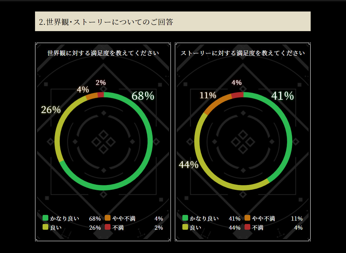 The second part of the NieR Reincarnation survey covers how well the story and setting were received in the closed beta test. 68% of players were very satisfied with what they saw, while 26% of players were satisfied. In regards to the story, 41% of players were very satisfied and 44% were satisfied. Comments in the survey praise the music, graphics, and the setting.