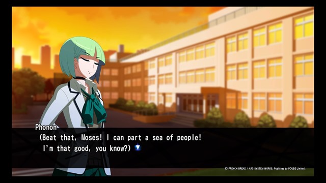 Which is exactly what she does with Muniel when you fight. Most of Phonon’s attacks are ranged. (She does have some kicks that allow you to hit people at a closer range.) But what’s really important is how Muniel forces people away and draws them closer. Dashing while attacking hits the opponent with such force that they fly as far as possible to the other side of the screen, while pressing back while attacking will pull an enemy closer even if they attempt to block. Her Impulsive Frustration attack, which can be held to charge, causes a good amount of damage and can make an enemy hit a wall and bounce off of it, if they are close enough to one. This is in addition to other special attacks that will send enemies up into the air or down to the ground.