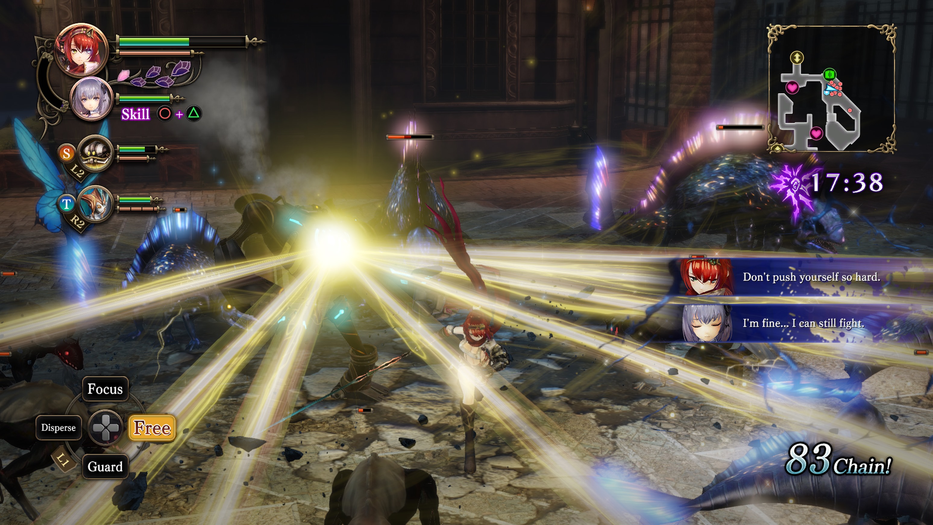 In addition to the costumes, details about Nights of Azure 2’s battle system and a story trailer have been released. Aluche and the Lilies she has as allies can perform a Double Chase combination attack to deal major damage to enemies. Aluche can also use Active Skills to fight foes, while Lilies’ Special Skills support Aluche and make her stronger. This will come in handy when facing larger enemies, like fiends. Also, if a fiend appears, keep an eye on your surroundings for environmental effects. Some barrels may hold a flame accelerant, for example, which can be used to help make fire-based attacks more effective against foes.
