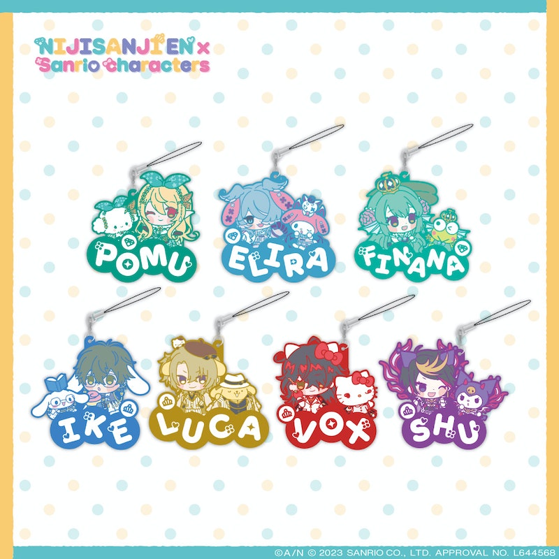 Vtuber agency Anycolor has announced new merchandise combining Vtubers from the English-speaking branch of Nijisanji with iconic Sanrio characters. The set includes badges, charms, acrylic stands, and pouches, which vary in price from 500 to 3,000 JPY.
