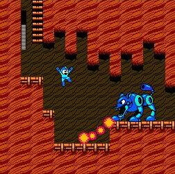 The clip from Mega Man 2 was taken from Wood Man’s stage. See the fire? It appeared as if it was on its own plane in front of Mega Man. The robot wolf and Mega Man were on their own plane and the background was behind.