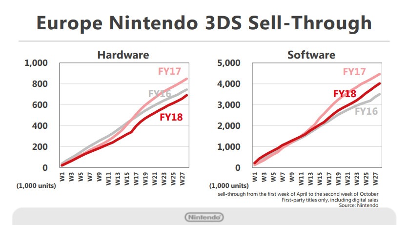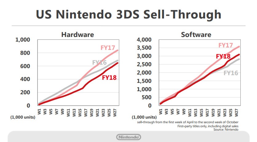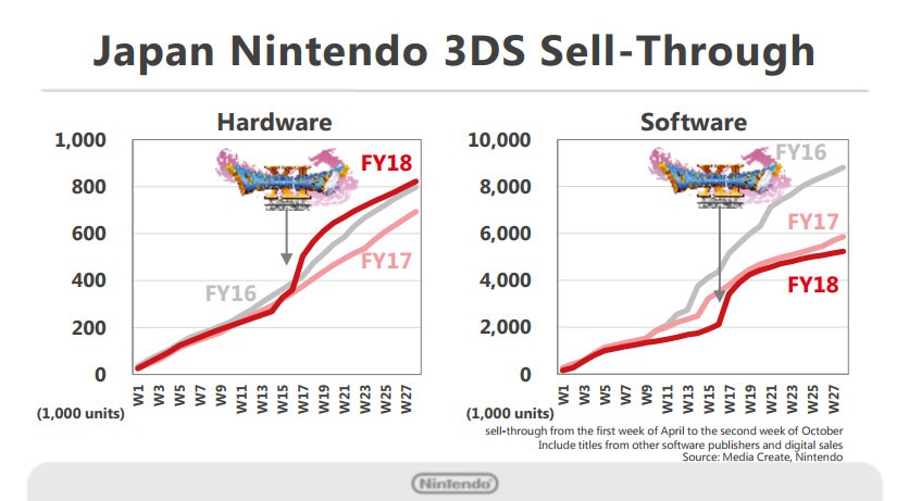 These are the figures for the Japanese market. For this graph alone, we include titles from other software publishers in the sales figures for software. In the domestic Japanese market, Dragon Quest XI: Echoes of an Elusive Age helped drive hardware sell-through upwards year-on-year. Nintendo 3DS sales in each region for both hardware and software have experienced no significant drop-offs, as shown above, and maintain the positive momentum we expected.