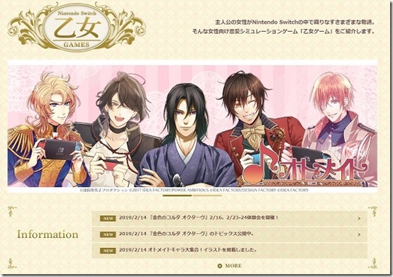 otome games site 1   Nintendo has opened a special site promoting various otome games that are available or upcoming for the Nintendo Switch, such as Kiniro no Corda Octave, Norn9 LOFN, and Nightshade/Hyakka Hyakurou. [Thanks, DenFamiNicoGamer!]   otome games site 2   It seems that this is a cross-marketing push by Nintendo with otome game makers such as Idea Factory’s Otomate brand and D3P Otome-bu, which have both retweeted and spread the news about the site. Other games by CaeruX, DigiMerce and Prototype are also listed on the site. At the very bottom, there is a comprehensive list of release dates for upcoming otome games coming to the Switch as well.   The genre has seen a surge on the system, with Idea Factory’s president even recently announcing that every Otomate console game is headed to the Switch. While currently the lineup is mostly enhanced ports of older games, there are a variety of new games that are in development as well.   You can find a link to the site here.