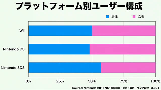 Nintendo shared a chart of male (blue) and female (pink) users. While the Wii and Nintendo DS are evenly split between genders, the 3DS is skewed towards male users.