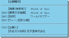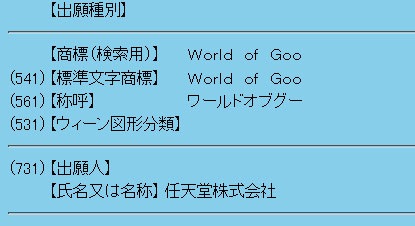 Recently, Nintendo of Japan registered “World of Goo” in the Japanese trademark database. While 2D Boy developed the game Nintendo can register the rights to the name World of Goo if they have intent to distribute or publish it. This is similar to how Natsume owns the rights to the name Harvest Moon and Atlus USA has Super Robot Taisen in their pocket even though Marvelous and Namco Bandai own the respective properties in Japan.