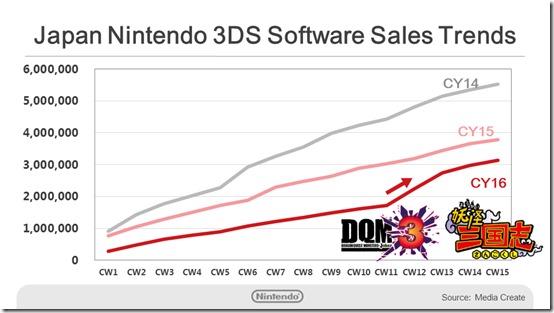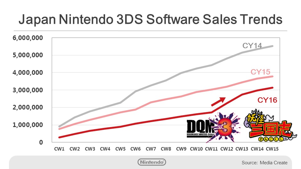 As for our recent situation, we have been seeing positive signs in Nintendo 3DS software sales in all regions since the start of the calendar year. This graph shows the Nintendo 3DS software sell-through in Japan from the start of the year through last week, compared with the same period over the last two years. The sell-through since the start of the calendar year has been lower than in the past two years, but titles that have launched in March and April, such as Dragon Quest Monsters: Joker 3 from Square Enix and Yo-kai Watch Sangokushi (Japanese title) from Level-5, have increased play activity for young consumers over the spring break and the start of the new school year, leading to a rise in sales.