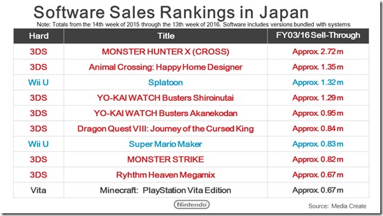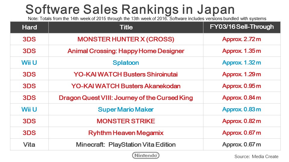 This is the ranking of video game software sales over the fiscal year ended March 2016 in Japan. Nintendo platform titles hold the top nine spots, including two Wii U titles and seven Nintendo 3DS titles. This proves that the Nintendo 3DS platform continues to hold a prominent position in the Japanese video game market. Also of note, the top 50 titles make up more than half the sales for the entire market. As I have mentioned in past financial briefings, this represents a continuing polarization of the market between titles that sell well and titles that do not.