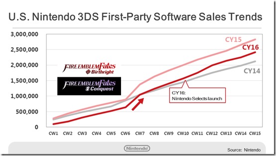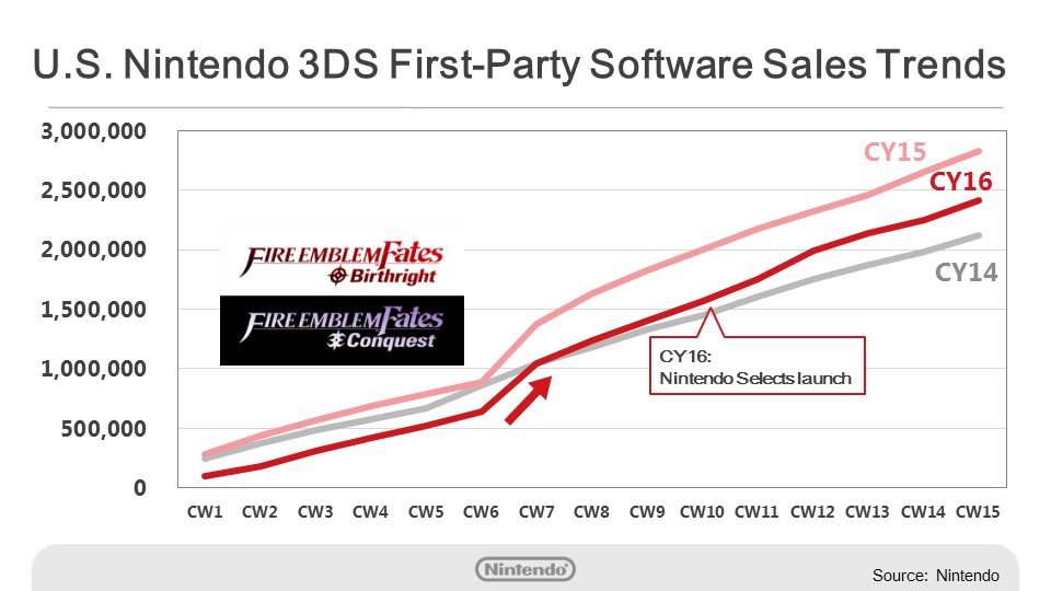 This graph shows the Nintendo 3DS first-party software sell-through in the U.S., compared with the same period over the last two years. Fire Emblem Fates was launched in America in February this year, building momentum for 3DS software sales. The discount versions of four titles introduced under the Nintendo Selects banner in March have also provided a positive impact.